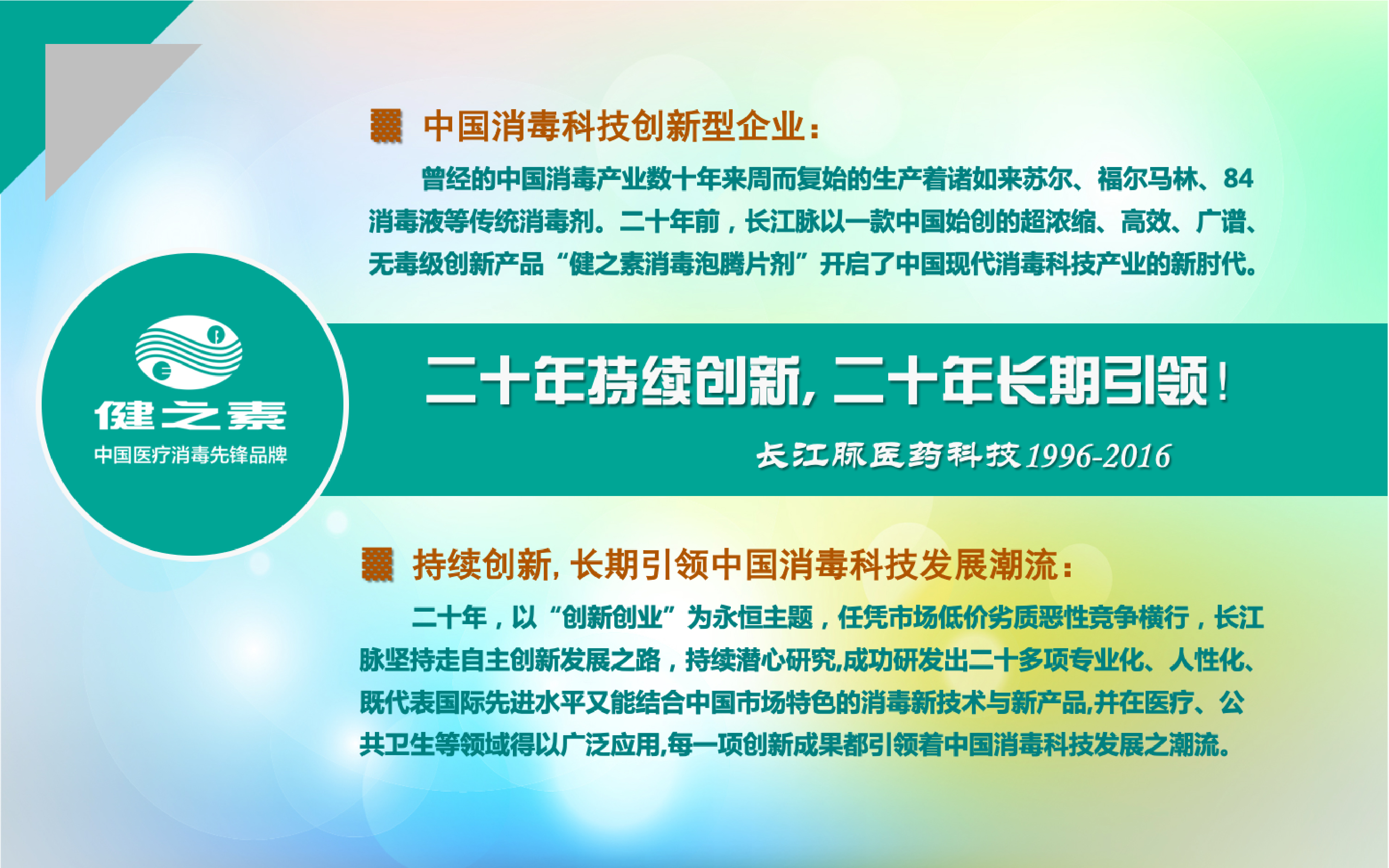 在醫療領域,長江脈以“健之素”為品牌的醫療消毒及感染控制全系列產品已覆蓋全國數千多家二級以上醫院用戶,是我國現代醫療消毒及醫院感染控制事業的奠基人和引領者,且早已成為我國醫療消毒及醫院感染控制領域市場上的先鋒品牌。