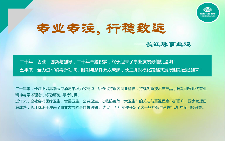 北京長江脈醫藥科技有限公司(以下簡稱“長江脈”),專注于“大衛生”事業二十年。市場涉及醫療消毒與感染控制、食品安全、公共衛生、環境衛生及水衛生、家庭衛生、動物衛生等領域;專業涉及化學消毒、物理消毒、生物消毒、化學污染處理、生物污染處理、微生物污染處理、微生態體系修復與重建等高科技領域。