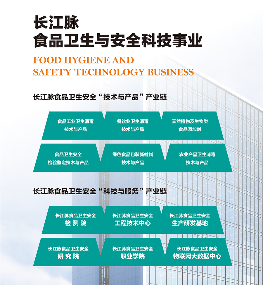 在食品安全領(lǐng)域,長(zhǎng)江脈構(gòu)建了“產(chǎn)品與技術(shù)”產(chǎn)業(yè)鏈及 “科研與服務(wù)”產(chǎn)業(yè)鏈,“產(chǎn)品與技術(shù)”產(chǎn)業(yè)鏈包括:食品工業(yè)衛(wèi)生消毒技術(shù)與產(chǎn)品、餐飲業(yè)衛(wèi)生消毒技術(shù)與產(chǎn)品、天然植物及生物類食品添加劑、食品衛(wèi)生安全檢驗(yàn)鑒定技術(shù)與產(chǎn)品、綠色食品包裝新材料技術(shù)與產(chǎn)品、農(nóng)業(yè)產(chǎn)品衛(wèi)生消毒技術(shù)與產(chǎn)品。“科技與服務(wù)”產(chǎn)業(yè)鏈包括:長(zhǎng)江脈食品衛(wèi)生安全檢測(cè)院、長(zhǎng)江脈食品衛(wèi)生安全工程技術(shù)中心、長(zhǎng)江脈食品衛(wèi)生安全研究院、長(zhǎng)江脈食品衛(wèi)生安全職業(yè)學(xué)院、長(zhǎng)江脈食品衛(wèi)生安全物聯(lián)網(wǎng)大數(shù)據(jù)中心。并以 “全案技術(shù)服務(wù)”及“全案技術(shù)實(shí)施”為主要市場(chǎng)服務(wù)模式,全方位服務(wù)于食品產(chǎn)業(yè)各領(lǐng)域。