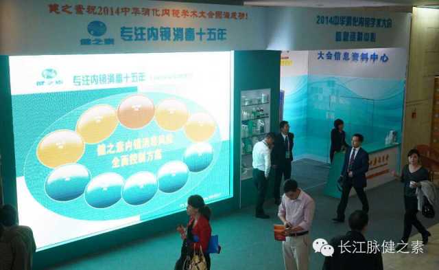 長江脈·健之素以前所未有的聲勢參加中華醫學會全國消化內鏡學術大會,近四千代表的大會充分展現了內鏡醫學迅猛發展的趨勢,而內鏡感染控制事業亦任重而道遠,這也正是長江脈的使命所在。 在山東大會堂正門兩側,長江脈兩塊巨大視頻及與醫學會共建的信息資料中心、大會茶歇,極大力度的展示了企業的科技與品牌形象,整個大廳都被"健之素綠"所照亮!