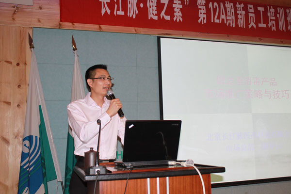 公司市場總部常務副總經理胡早云正在講授《健之素消毒產品市場推廣策略與技巧》