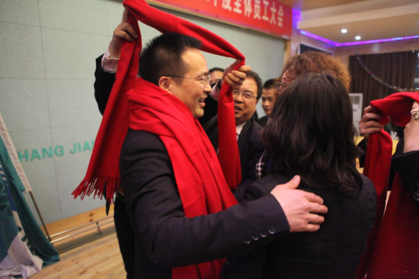 獲獎者自發地將象征榮譽與奉獻的紅圍脖披在戴總身上,以示感激!