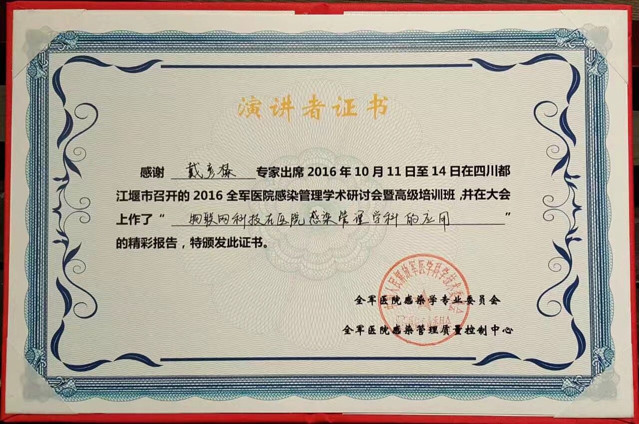 2016年10月11日一14日,“2016全軍醫院感染管理學術研討會及高級培訓班”在四川都江堰市召開,北京長江脈醫藥科技有限公司董事長戴彥榛先生應邀出席,并為大會作了“現代物聯網科技在醫院感染學科的應用”的精彩學術報告。